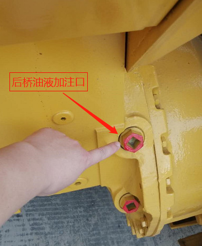 5.清理加注口,保持加注口清洁,拆开加注口,并清理放油口塞堵。到放油口处油液断流时,将放油塞堵装回紧固。从加注口加注油液(SAE15W-40 CF)。